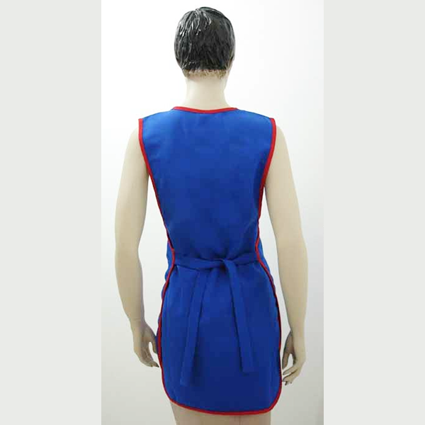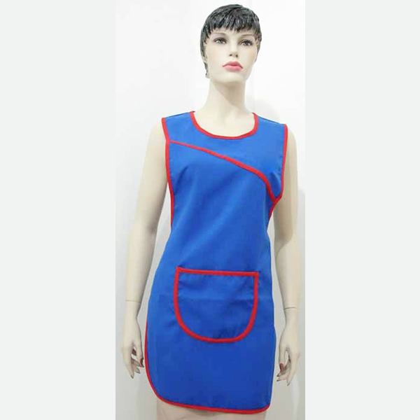 Avental duplo, c/cabeção frontal diagonal, grande bolso frontal, modelo avivado, ajuste por atilhos.
