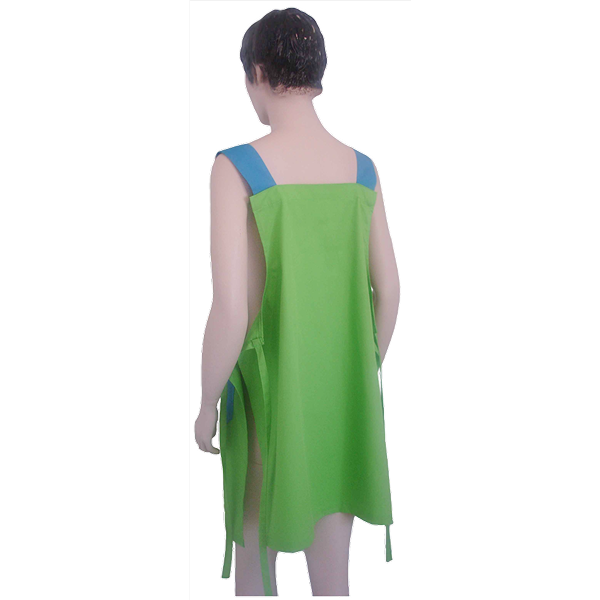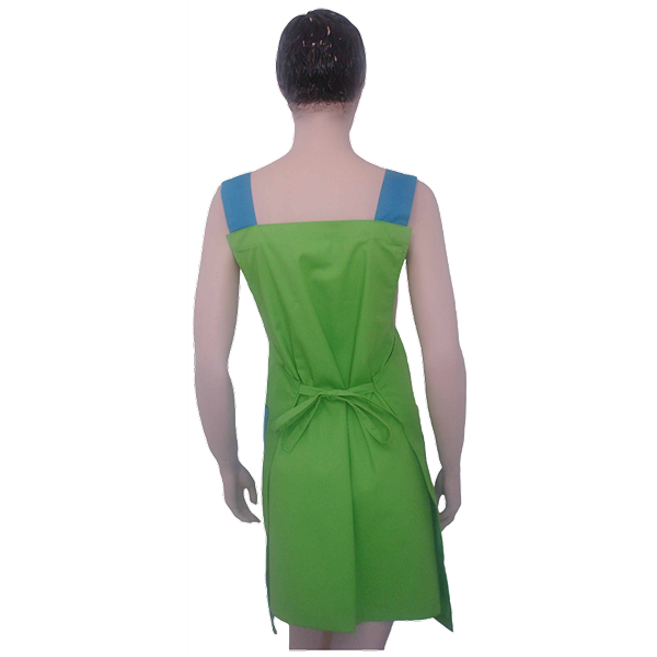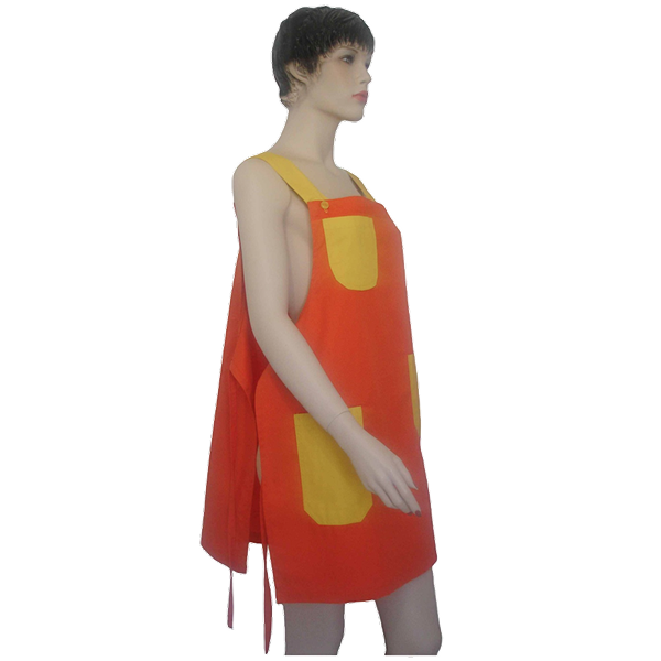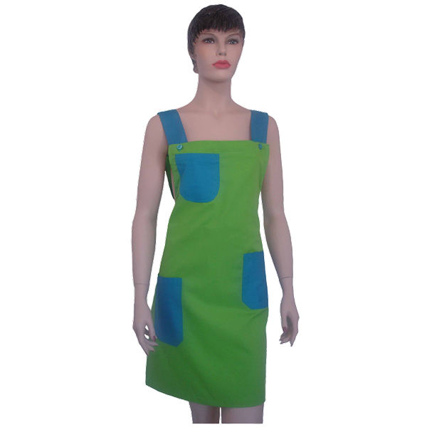Avental duplo, dois bolsos inferiores e um superior, ajuste por atilhos.